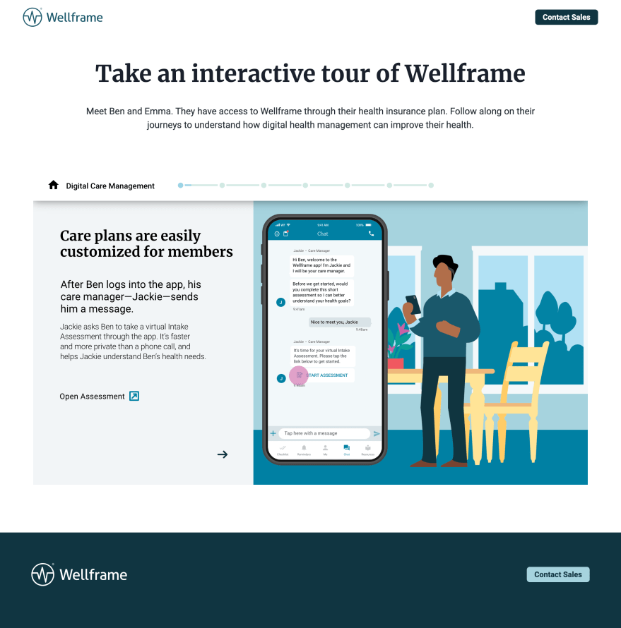 Nothing can replace a person-to-person conversation and demo, but as decision makers were weighing their options early on in the sales cycle, they needed help visualizing the Wellframe platform in action. That’s why my team built an interactive demo that allowed prospective buyers to take a guided click-by-click tour.